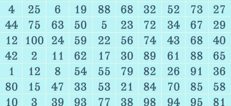 Представлена сама таблица. Она содержит числа от 1 до 100. Каждое число символизирует разную дальнейшую судьбу. Советуем пользоваться этим методом не чаще одного раза в неделю. Наиболее эффективна таблица в полнолуние, новолуние и в такие дни, как 29 февраля, 31 декабря, 1 января, дни солнцестояния или равноденствия и так далее.