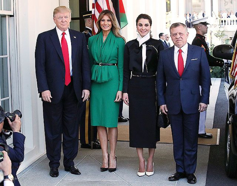 Мелания Трамп ни на секунду не расслабляется, ведь она сопровождает мужа, президента США Дональда Трампа на всех официальных встречах с первыми лицами государств. 5 апреля Дональд и Мелания пригласили в Белый дом короля Иордании Абдаллу II и королеву Ранию, которые прилетели в Америку с краткосрочным визитом.