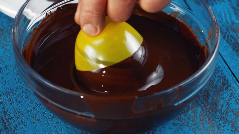 - Достань шары с шоколадом из холодильника и аккуратно проткни их иголкой. Затем осторожно извлеки шарики из шоколадных оболочек. И вот — яичная «скорлупа» готова!