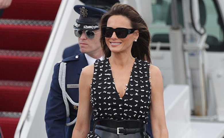 По этому случаю Мелания Трамп (или ее стилист) выбрала темно-синее платье фасона new look, подчеркнув талию широким ремнем Steve McQueen и дополнив наряд классическими лодочками Christian Louboutin.