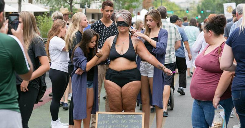 Рядом с собой Эй поставила табличку, на которой было написано следующее: “Я стою здесь ради всех, кто подобно мне, борется со своей заниженной самооценкой. Мы все очень разные! Поддержите мое и свое самопринятие, написав что-то на моем теле”.