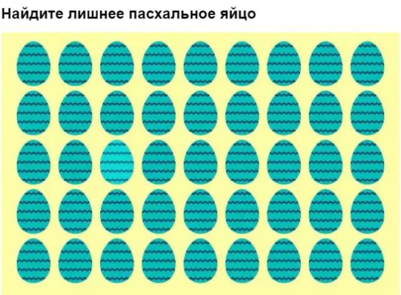 Мы предлагаем вам окунуться в пасхальную атмосферу, начав с легкого теста на внимательность! Просто посмотрите на картинку и отыщите лишнее яйцо. Чем быстрее вы справитесь, тем лучше можно оценить ваше умение концентрироваться. Вперед!