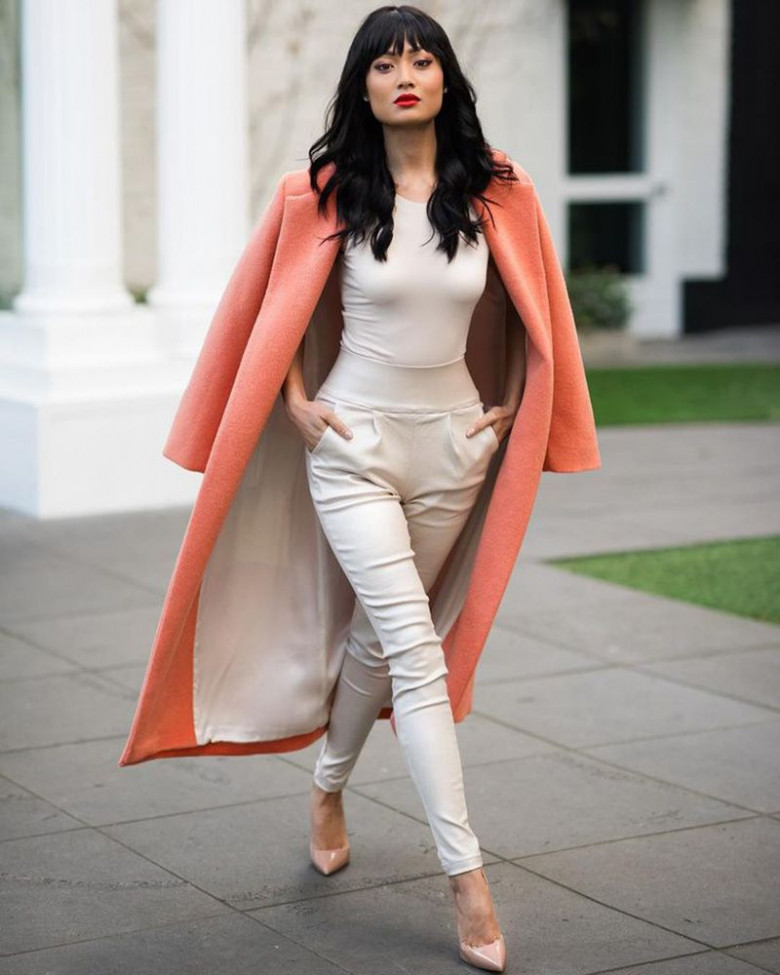 - Этот образ можно дополнить классическими туфлями того же цвета, что и жакет, и объемной сумкой.