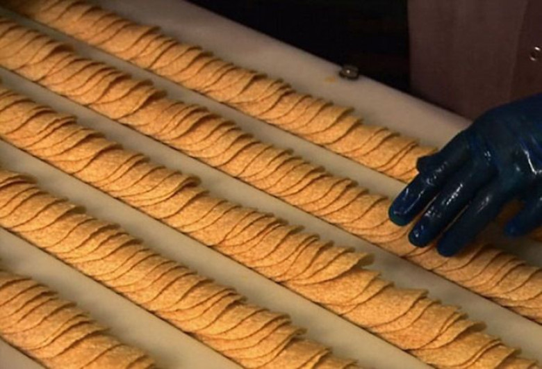 Механизм для взвешивания автоматически определяет, сколько чипсов должно быть в каждой упаковке, после чего специальная лопатка укладывает их в знакомые нам цилиндры.