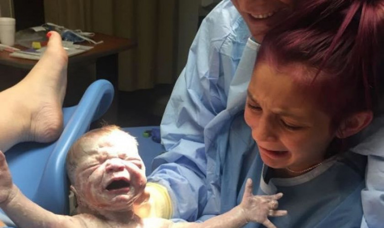 После этого храбрая девочка со слезами радости на глазах поднимает новорожденного брата Кайсона Каррауэйя повыше, чтобы его впервые увидела мама.
