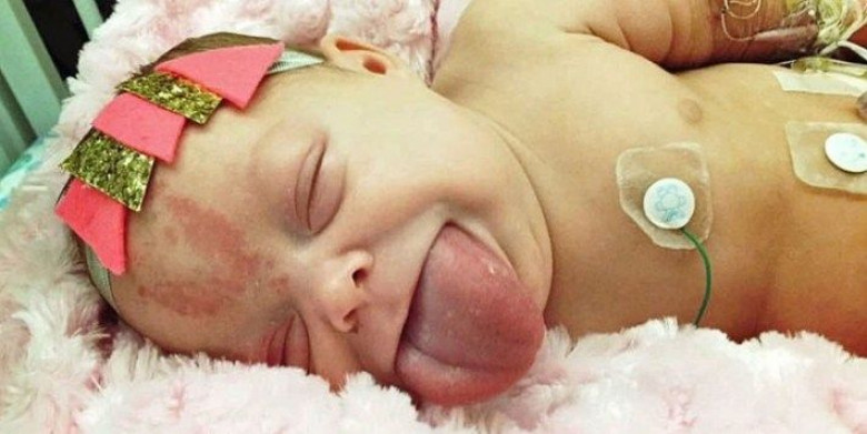 Оказалось, что из-за сбоя в ДНК у девочки развился синдром Беквита-Видеманна. Причем макроглоссия (тот самый большой язык) — самая безобидная из форм протекания болезни. Синдром чреват внутренними пупочными грыжами, увеличением жировой и мышечной массы, гигантизмом и проблемами с дыханием. Так что этой малышке еще несказанно повезло!