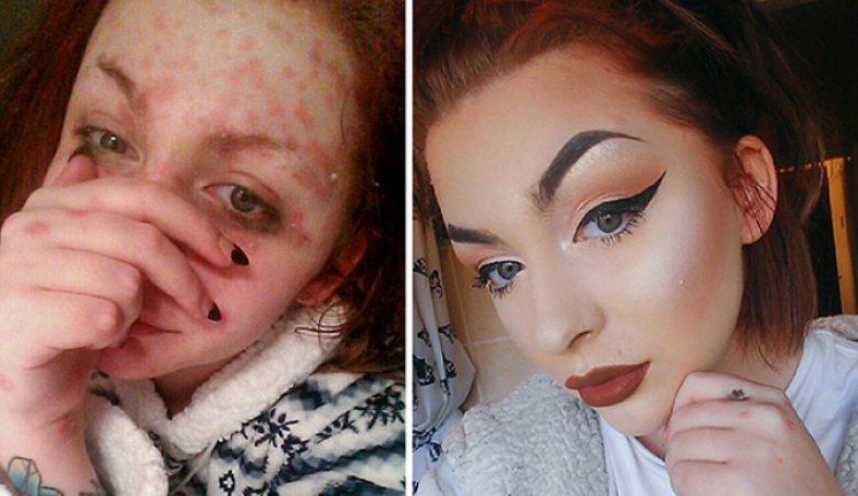 Но она решила не закрываться в себе, а принять себя такой, какая есть. Чтобы побороть комплексы, британка начала выкладывать в Сеть фотографии до и после нанесения макияжа.