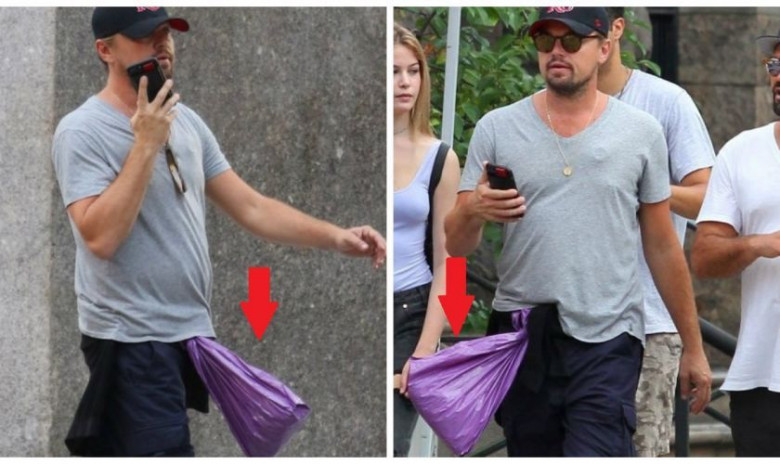 На поясе у оскароносного лауреата был закреплен обычный полиэтиленовый пакет сиреневого цвета, который болтался во время ходьбы. Содержимое этого пластикового мешка осталось загадкой. То ли там лежали товары из ближайшего супермаркета, то ли Лео попросту выносил мусор...