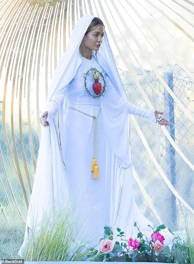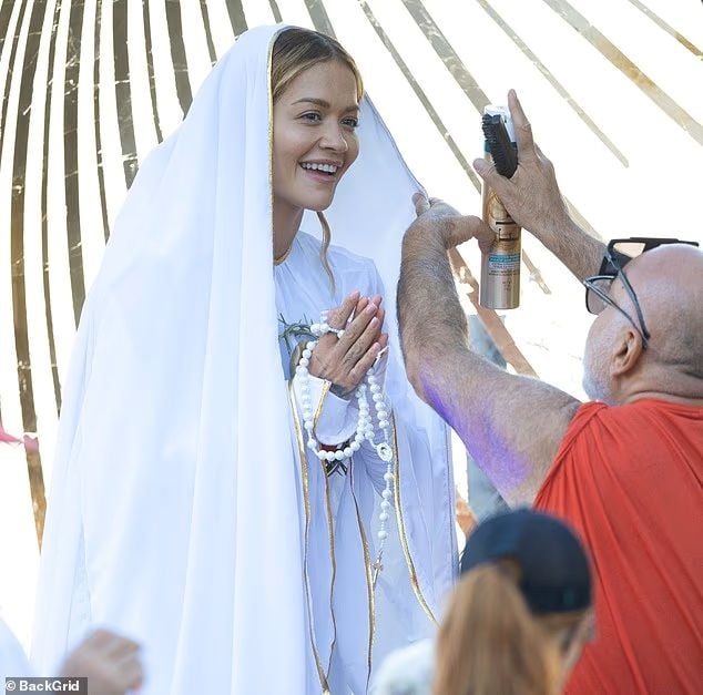 34-летняя певица Рита Ора предстала в неожиданном и дерзком образе во время съёмки в Лос-Анджелесе. Артистка облачилась в белоснежные свободные одежды и длинную фату до пола, держа в руках чётки и позируя с молитвенно сложенными руками, пишет Daily Mail.