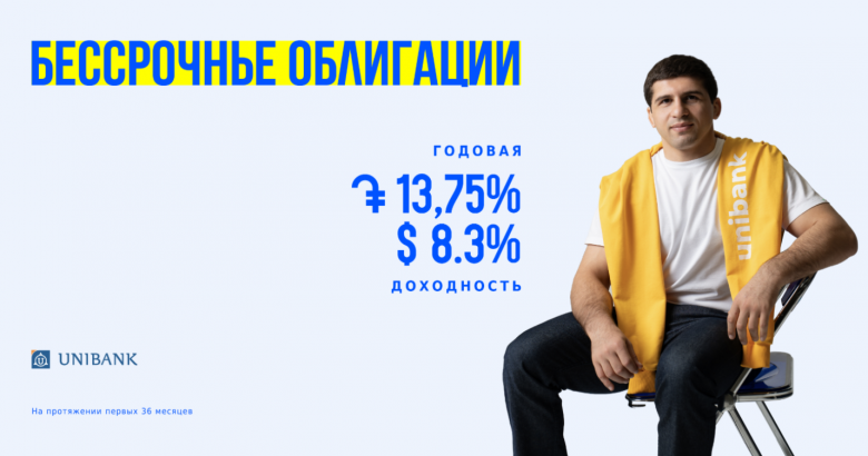 Юнибанк объявляет о размещении первых на армянском рынке бессрочных облигаций общим объемом 3,5 млрд драмов РА и 9 млн долларов США. Купонная ставка по драмовым облигациям составляет 13,75% годовых, а по долларовым — 8,3% годовых.