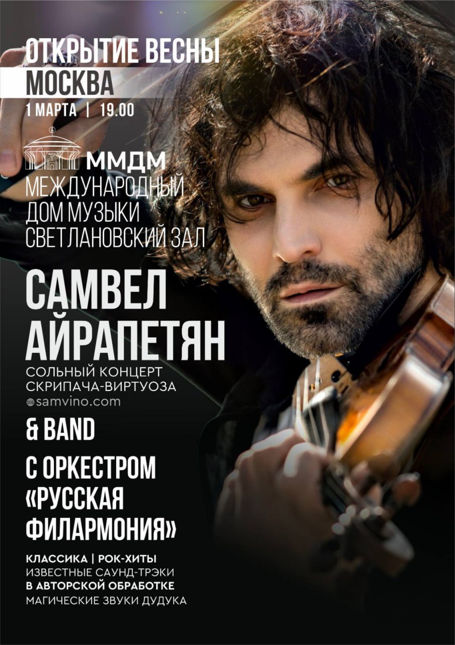 Культура1 марта в 19:00 в Московском международном Доме музыки пройдет концерт скрипача-виртуоза Самвела Айрапетяна и его бэнда при участии оркестра «Русская филармония». Гостей ждет экспрессивное шоу, объединяющее классику и современное звучание.